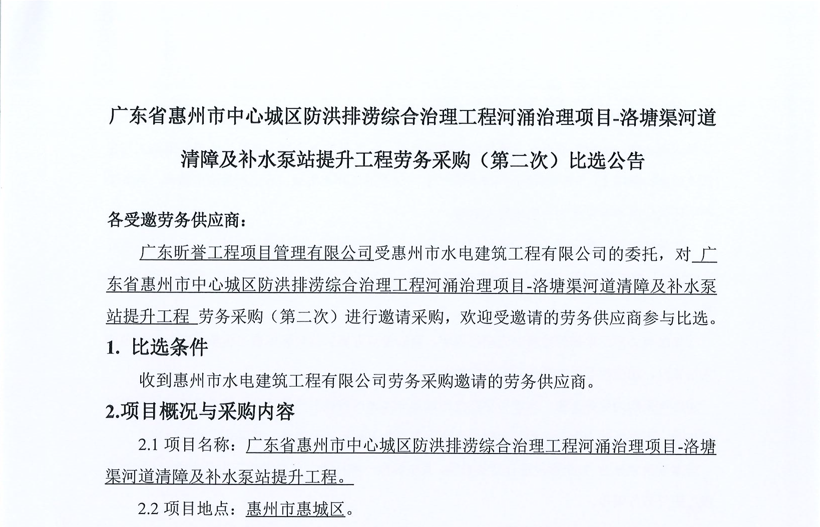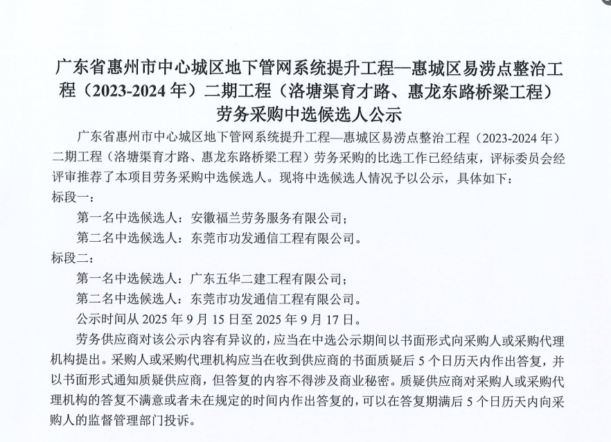 廣東省惠州市中心城區(qū)地下管網(wǎng)系統(tǒng)提升工程-內(nèi)街小巷排水管網(wǎng)病害修復(fù)及錯混接改造項(xiàng)目一期施工勞務(wù)采購比選公告……